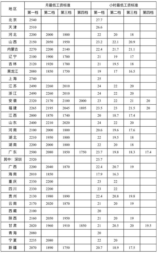 目前,最低工资标准档位最多为四档。数据显示,从月最低工资标准看,上海以2740元的标准居全国首位;从小时最低工资标准看,北京以27.7元的标准为全国最高。